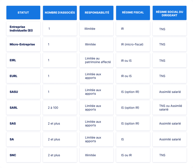 The choice of a company's legal status should be guided by the specific needs of the project, the level of protection sought, taxation and management requirements. Here's a comparison of the main legal forms based on essential criteria, to help every entrepreneur make the right decision.