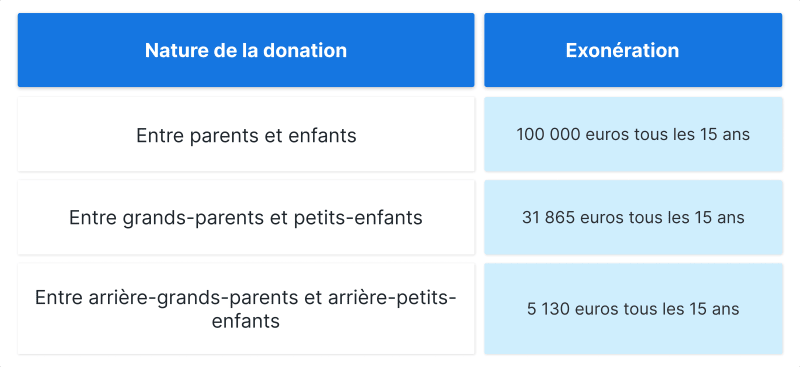 The exemption from transfer duties applies according to the degree of kinship at the time of the donation: