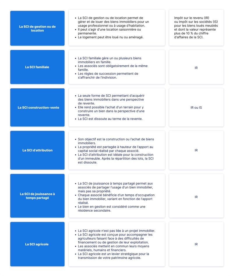 A société civile immobilière (SCI) is a legal entity with legal personality. The purpose of an SCI is to achieve objectives related to the management of real estate assets.